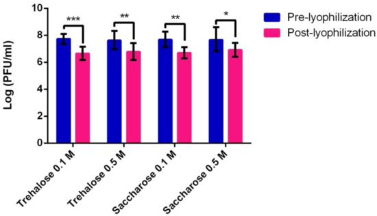 Effect on viability of phage vRsoP-WF2 of lyophilization with saccharose or trehalose at 0.1 M or 0.5 M. Titration was carried out by the double layer agar method on CPG plates. Data are the means for assays performed at least in triplicate, and error bars indicate variation as the standard deviation. Asterisks above bars denote statistically significant differences between the two signaled columns: * p < 0.05, ** p < 0.01, *** p < 0.001.
