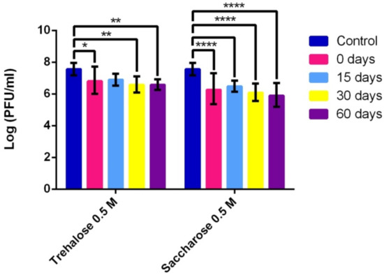Stability of phage vRsoP-WF2 lyophilized with trehalose or saccharose at 0.5 M and stored at 4 °C over time. Titration was carried out by the double layer agar method on CPG plates. Data are the means for assays performed at least in triplicate, and error bars indicate variation as the standard deviation. Asterisks above bars denote statistically significant differences between the two signaled columns: * p < 0.05, ** p < 0.01, **** p < 0.0001.
