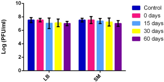 When these results were compared with those obtained with controls maintained in LB medium and in SM buffer at 4 °C, it was observed that the stability was greater for these controls within the experimental period, and pronounced losses of viability as those obtained with the lyophilization process did not occur. However, lyophilization has several advantages, such as the smaller volume of sample to be preserved as opposed to the larger volumes of microbial suspensions in liquid media; greater ease of transport and shipping; lower maintenance costs because it does not require subzero temperatures; and a lower risk of contamination, since lyophilized viral particles are dehydrated and in vacuum conditions, unlike stocks of viral suspensions in liquid media.