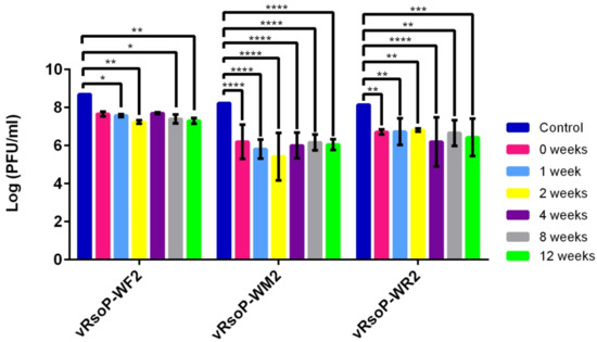Stability of phages vRsoP-WF2, vRsoP-WM2 and vRsoP-WR2 lyophilized with trehalose at 0.5 M and stored at 4 °C over time. Titration was carried out by the double layer agar method on CPG plates. Data are the means for assays performed at least in triplicate, and error bars indicate variation as the standard deviation. Asterisks above bars denote statistically significant differences between the two signaled columns: * p < 0.05, ** p < 0.01, *** p < 0.001, **** p < 0.0001.