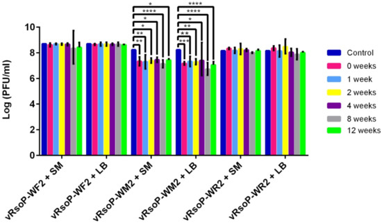 Stability of phage vRsoP-WF2, vRsoP-WM2 and vRsoP-WR2 suspensions preserved in LB medium and in SM buffer at 4 °C over time. Titration was carried out by the double layer agar method on CPG plates. Data are the means for assays performed at least in triplicate, and error bars indicate variation as the standard deviation. Asterisks above bars denote statistically significant differences between the two signaled columns: * p < 0.05, ** p < 0.01, *** p < 0.001, **** p < 0.0001.