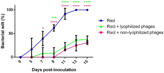 Bacterial wilt biocontrol assays in planta inoculated with Ralstonia solanacearum strain CFBP 4944 and a mixture of the phages vRsoP-WF2, vRsoP-WM2 and vRsoP-WR2 either nonlyophilized or lyophilized after 4 weeks. Mixtures were co-inoculated at final concentrations bacterium:phages of 105 CFU/mL:108 PFU/mL. Positive controls (Rsol) were at 105 CFU/mL. Negative controls (mixtures of phages) were at 108 PFU/mL. Additional negative controls were performed with PBS. Plants inoculated with negative controls, either mixtures of phages or PBS, did not develop wilting symptoms (not shown). Data are the means for assays performed in triplicate, and error bars indicate variation as the standard deviation. Asterisks denote statistically significant differences between the treatments: * p < 0.05, *** p < 0.001, **** p < 0.0001.