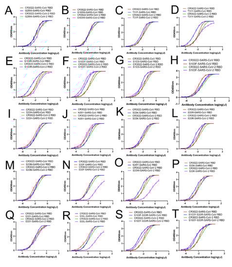 Analysis of the ability of 18 single-site mutants and two double-site mutated antibodies to bind SARS-CoV RBD and SARS-CoV-2 RBD with wild-type in ELISA. The ability of the wild-type and mutant antibodies as indicated in the individual binding curves were tested in 12-fold serial dilutions for binding to SARS-CoV RBD and SARS-CoV-2 RBD. The binding curves of (A–T) were single-site mutant of G28W, T31F, T31Y, S103R, S103I, S103F, S103W, S103Y, S33R, S33H, S33I, S33L, S33K, S33M, S33F, S33W, S33Y, N35Y and two double-site mutants of S103F(H)–S33R(L) and S103Y(H)–S33R(L), respectively.