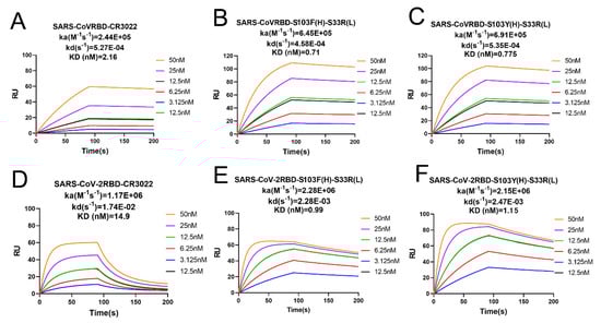 CR3022 was originally found to be bound to SARS-CoV, with an affinity constant of 2.16 nM (Figure 4A). As the affinity constant is shown in Figure 4B,C, the affinity constant of both modified antibodies to SARS-CoV-2 RBD was improved but not to the degree to bind SARS-CoV-2 RBD. S103F(H)–S33R(L) bound strongly to SARS-CoV-2 RBD with an association rate (ka) of 2.28 × 106 and dissociation rate (kd) of 2.28 × 10−3, and to S103Y(H)–S33R(L) with an association rate (ka) of 2.15 × 106 and dissociation rate (kd) of 2.47 × 10−3, but CR3022 exhibited a low affinity for SARS-CoV-2 RBD with an association rate (ka) of 1.17 × 106 and dissociation rate (kd) of 1.74 × 10−2 (Figure 4E–F).