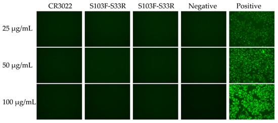 Autoimmune reactivity of wild-type and variants of CR3022 (CR3022, S103F–S33R and S103Y–S33R) to human Hep2 cells with TNM002 as negative control and LC0042 as a positive control. Green fluorescence was photographed under an EVOS fluorescence microscope. The three antibodies to be tested (CR3022, S103F–S33R and S103Y–S33R) and negative control antibody TNM002, positive control antibody LC0042 were added at three concentrations of 25 μg/mL, 50 μg/mL and 100 μg/mL, respectively.