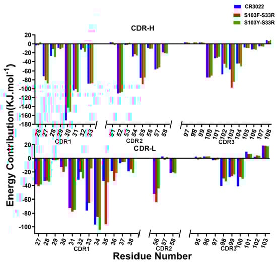 The equilibrated MD trajectory was selected to calculate the relative binding free energy by using the MM-PBSA method, for analyzing the thermodynamic changes between wild-type CR3022 and its two double-site mutated antibodies. As listed in Table 3, the binding free energy () of SARS-CoV-2 RBD with the wild-type CR3022 antibody, S103F–S33R and S103Y–S33R complexes were calculated to be −290.01 ± 20.57, −321.63 ± 23.97 and −348.21 ± 17.85 kJ/mol, respectively. Their binding free energy is primarily composed of electrostatic energy, van der Waal energy, and polar/non-polar solvation energy. The calculation results showed that van der Waal energy contributed the most to the binding affinity, followed by electrostatic energy, whereas the polar solvation energy was detrimental to the binding of antigens and antibodies. The MM/PBSA calculation results indicated that the value of the antibody could be decreased after modification, implying that the binding affinity of double-site mutated antibodies was much stronger than that of the wild-type CR3022.