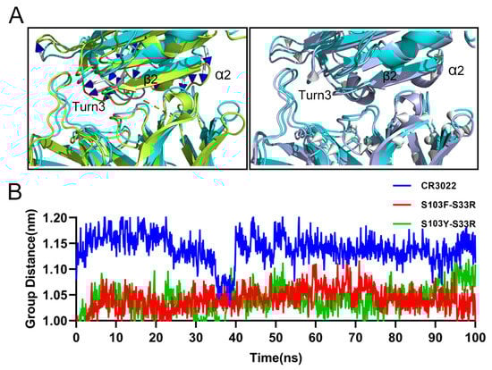 The previous binding thermodynamic analysis demonstrated that the modified antibodies were more accessible to binding SARS-CoV-2 RBD. It was mainly attributed to the increased RBD accessible surface and more matched structural complementarity. It was found that the distance between two double-site CR3022 mutants and the key secondary structures of SARS-CoV-2 RBD also changed. As displayed in Figure 8A the distance between the secondary structures of the β-sheet2, turn3, and α-helix2 (in the S103F–S33R-RBD and S103Y–S33R–RBD systems) and the CDR region of the CR3022 was significantly reduced compared with the wild-type CR3022–SARS-CoV-2 RBD system. The distance fluctuations of wild-type CR3022 could be around 1.1–1.2 nm, whereas that of two modified antibodies fluctuated were around 1.0–1.05 nm. It was obvious that the distance of these key residues involved in the binding interactions between CDR of the modified antibody and key secondary structures was much closer than that of the wild-type CR3022 during the MD run (Figure 8B). These calculation results were consistent with the experimental observation of affinity enhancement. Nevertheless, as the ribbon diagram of SARS-CoV-2 RBD–S103Y–S33R was also shown in Figure 8, the rearrangement that occurred in the epitope was not particularly significant, except for α-helix2.