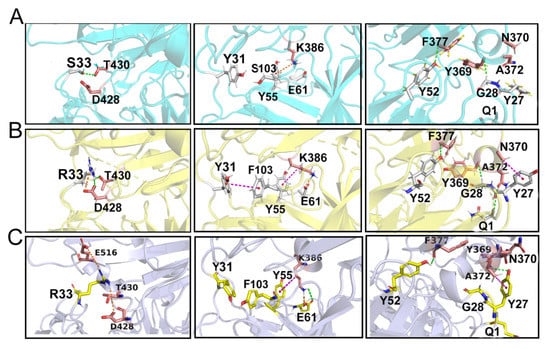 Hydrogen-bonded and hydrophobic interaction network analysis. Three secondary structures (α-helix2, β-sheet2 and β-turn3) on the SARS-CoV-2 RBD participated in non-covalent bonded interaction with the CDR regions of the antibodies. This specific hydrogen, electrostatic and hydrophobic interaction of CR3022 SARS-CoV-2 RBD (A, in cyan), S103F–S33R–RBD (B, in yellow) and S103Y–S33R–RBD (C, in purple) with IMGT number were represented by the green dashed line, gold dashed line and magenta dashed line, respectively.