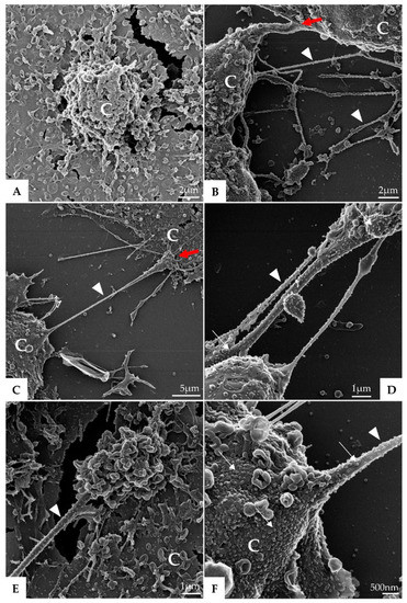 Vero-E6 cells 48 h post-infection with SARS-CoV-2 (HIM images). (A) Uninfected Vero-E6 cell at 48 h of cultivation (cell control). (B–F) Infected cells presenting filopodia (arrowhead); connection (red arrow) between adjacent cells mediated by filopodia was observed. Virus particles (thick arrow) attached to cell filopodia and with cell membrane were observed. Cell (C).