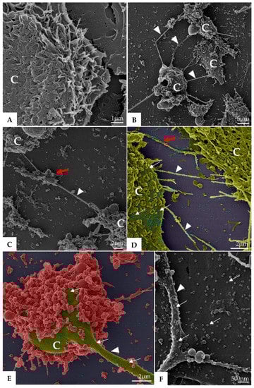 Vero-E6 cells 72 h post-infection with SARS-CoV-2 (HIM images). (A) Uninfected Vero-E6 cell at 72 h of cultivation (cell control). (B–E) Infected Vero-E6 monolayer, connection (red arrow) between cells mediated by filopodia was observed (B–D). Virus particles (thick arrow, blue structures) was detected attached to cell filopodia (green, image (D)) and with cell membrane (green or red, image (D–F). Cell (C), filopodia (arrowhead). The images (D,E) were colored in Adobe photoshop.