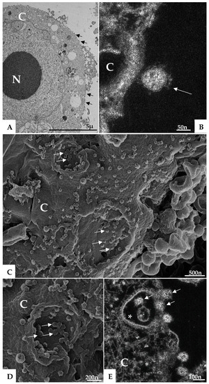 For transmission electron microscopy analysis, the infected and non-infected control (mock) monolayers of cells were tripsinized at 48 and 72 h pi. Cell suspensions were fixated in 2.5% glutaraldehyde in sodium cacodylate buffer (0.2 M, pH 7.2), post-fixated in 1% buffered osmium tetroxide, dehydrated in acetone, embedded in epoxy resin, and polymerized at 60 °C over the course of three days [26,27]. Ultrathin sections (50–70 nm) were obtained from the resin blocks. The sections were picked up using copper grids (300 mesh and no coating) and observed using Cs Corrected FEI Titan 80–300 (ThermoFisher Scientific, Waltham, MA, USA) and Hitachi HT 7800 (Hitachi, Tokyo, Japan) transmission electron microscopes. In the FEI Titan images were collected in scanning transmission electron microscopy (STEM) mode using a high-angle annular-dark field detector (HAADF) working at 80 kV high tension, 19 mrad convergence angle and probe size around 0.1 nm, 100 pA beam current, 2 up to 8 μs dwell time, and 2048 × 2048 pixels per image. For analysis in helium ion microscopy, infected and non-infected control (mock) monolayers were grown on sterile glass coverslips and fixed at 48 and 72 h pi, in 2.5% glutaraldehyde in sodium cacodylate buffer (0.2 M, pH 7.2), dehydrated in ethanol and submitted to critical-point-drying. The cells were analyzed in an Orion NanoFab Helium Ion microscope (Zeiss, Baden-Württemberg, Oberkochen, Germany) equipped with a flood gun and an Everhart–Thornley secondary electrons detector, flood gun is used to allow analyzing the cells without any conductive coating. Images were collected at 30 kV high tension, around 0.8 pA beam current, 32 up to 256-line average, 1 µs dwell time, 100 µs flood gun time, and 2048 × 2048 pixels per image.