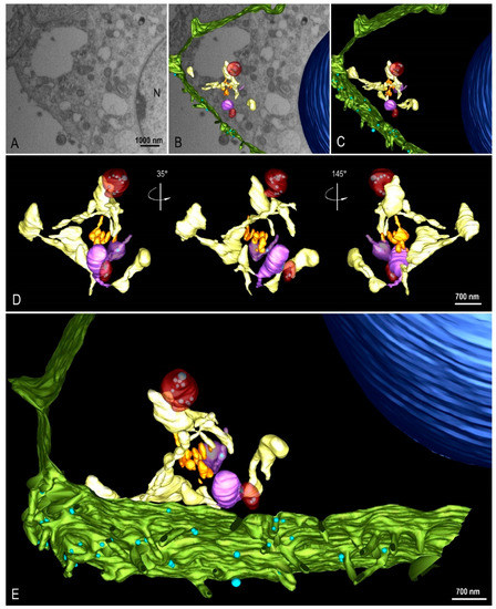 (II) Assembly of viral particles—Virus particles have been observed inside several cytoplasmic compartments including endosomes, RER, DMVs, intermediate vesicles (IV), and exosomes (Figure 7A,B). FIB-SEM images and three-dimensional (3D) modeling of the Vero-E6 cell, 48h pi, showed the interaction between different cellular compartments (Figure 8A–E see also Video S1).