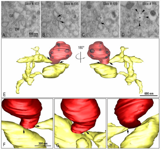 Interaction between the rough endoplasmic reticulum (ER) and double membrane vesicle (DMV). (A–D) FIB-SEM image sequence showing the ER and its connection (arrows) to a DMV (asterisk). Some virus particles can be seen inside the DMV (arrow heads). (E–H) 3D model of the DMV (red), virus particles (purple) inside the DMV and the ER (yellow). The regions of connection of the ER to the DMV are indicated with arrows. Interconnections within the ER network can be observed.