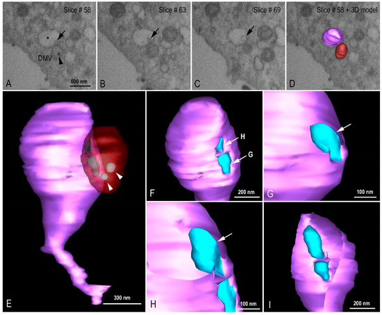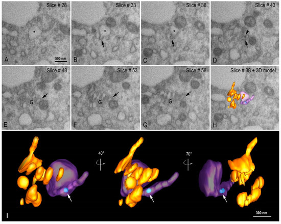 Golgi complex was observed by FIB-SEM image sequence and 3D modeling (Figure 11A–I, see also Video S3) close to the IVs containing virus particles, a fact that allows us to infer a possible relationship between both.