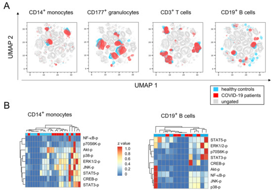 Multidimensional flow cytometry and phosphoprotein analyses revealed minor changes of bulk immune cell response during mild-to-moderate COVID-19. (A) UMAP projection of flow cytometry data show the topological distribution of immune cell populations based on differentially expressed surface antigen patterns between healthy controls and COVID-19 patients. (B) Heatmaps of normalized protein phosphorylation data from sorted CD14+ monocytes (left) and CD19+ B lymphocytes (right) demonstrated contingent hierarchical clustering of healthy controls and COVID-19 patients.