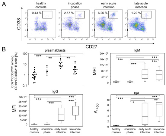 As was recently described for COVID-19, enrichment of a distinct population of the B lineage cells may indicate a shift from the steady state immune constitution and point towards an early adaptive response [19,20,21]. Indeed, we found a transient increase of CD19+CD45RA+CD27+CD38bright plasmablasts in consecutive samples from COVID-19 patients (Figure 2A).