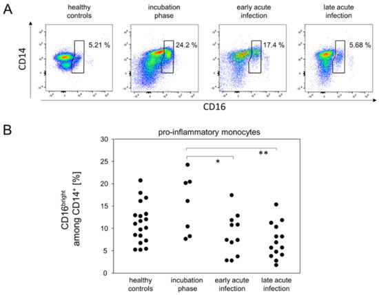 Building on the fact that early phases of viral infection trigger innate immune responses, we sought to investigate the dynamics of monocyte and granulocyte subpopulations between the above postulated disease phases. Peripheral monocytes were defined via sideward scatter and expression of CD14. The additional analysis of CD16 expression allowed for the differentiation of classical (CD14+CD16−), anti-viral (CD14+CD16+) and pro-inflammatory monocytes (CD14+CD16bright). Figure 3 demonstrates for the contingent of pro-inflammatory monocytes a moderate but statistically not quite significant increase in the incubation phase when compared to healthy controls (p = 0.0766). However, upon progression into the acute infection phases, this population of monocytes was significantly reduced (Figure 3). Finally, we did not find any meaningful differences between the remaining monocyte subpopulations and the various phases of the disease (Table S7).