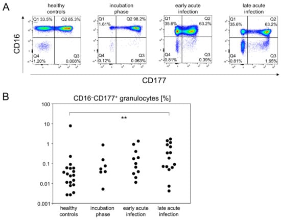 The portion of CD16−CD177+ granulocytes gradually increased until the late acute infection phase. (A) Representative pseudocolor plots of CD16 and CD177 expression data of SSChi leukocytes showed that CD16−CD177+ granulocytes specifically emerged at the late acute infection phase (Q3 gate). (B) Quantitative flow cytometry data indicated gradually increasing abundances of CD16−CD177+ granulocytes. ** p < 0.01; Tukey-Kramer test.