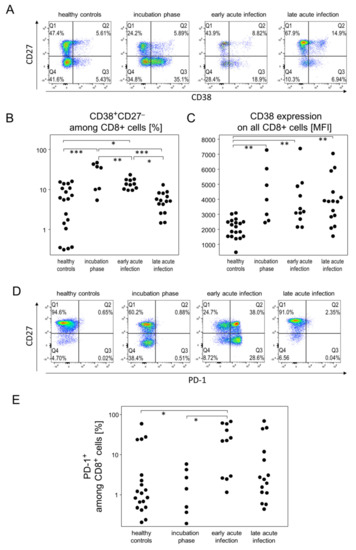 In summary, while the increase of activated CD38+CD27− and activated or exhausted PD-1+ cytotoxic T cells was mostly restricted to the incubation phase and early acute infection, respectively, we found the activation marker CD38 to be overexpressed during all disease phases.