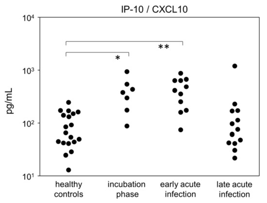 Quantitative data of IP-10 concentrations in plasma samples at different disease stages. * p < 0.05; ** p < 0.01; Tukey-Kramer test.