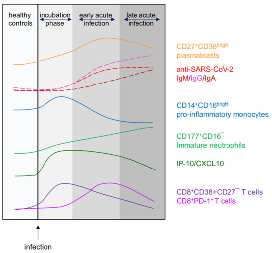 By analyzing longitudinal trajectories of immune responses to SARS-CoV-2 in patients experiencing mild-to-moderate disease courses, we were able to define three different stages (Figure 8). The first one comprises the incubation phase, which for the patients manifested with symptoms that led to voluntary testing or—in the case of elderly or multimorbid patients—to hospitalization. The immune response in this phase of disease progression is characterized by significant increases in pro-inflammatory monocytes (CD14+CD16bright), activated cytotoxic T cells (CD38+), and serum IP-10 paralleled by a significant decrease of peripheral T helper cell numbers. This incubation phase is followed by the early acute infection where peripheral plasmablasts (CD27+CD38bright) are transiently yet significantly elevated, as are exhausted cytotoxic T cells (PD-1+). IP-10 is still significantly upregulated, while both helper and cytotoxic T cells are significantly reduced. Virus-specific IgM, IgG and IgA antibodies are detectable, and except for IgM, still on the rise. Finally, during late acute infection, most values appear to be returning to normal except for virus-specific antibodies and immature neutrophils which are now significantly elevated compared to the healthy controls (Figure 8).