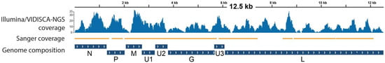 Plasma and cerebrospinal fluid were analyzed by VIDISCA-NGS to identify known and unknown viruses. VIDISCA-NGS identified 19,505 sequence reads in the patient’s plasma and 26,233 in her CSF. Several reads from the patient’s plasma belonged to a divergent rhabdovirus which prompted further genomic characterization by Illumina sequencing and genome walking on low-coverage regions. Accordingly, the complete coding sequence of the genome could be characterized (Figure 1). An RT-qPCR developed for the virus identified a viral load in the patient’s plasma of 3.85 × 103 RNA copies/mL. No viral reads could be detected in the CSF VIDISCA-NGS library, nor could viral RNA be detected in the patient’s CSF by RT-qPCR; the viral load was undetectable in her plasma at the 12-month follow-up.