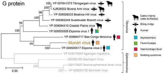 The discovery of MUNV in the bloodstream of a human, which was not predicted to be a host reservoir, suggests that humans are accidental and potential dead-end hosts [15,17]. Given that multiple other tibroviruses have been detected in cattle (mainly water buffaloes, Figure 2), future research attempting to establish the host reservoir of MUNV and other human-infecting tibroviruses may focus on these animals first.