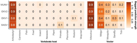 The MUNV genome was analyzed by a machine-learning algorithm to predict its potential vertebrate host and arthropod vector [17]. This algorithm suggested MUNV to be an arbovirus (bagged prediction score of 0.9 (BPS)) transmitted by midges (BPS 0.4) with an artiodactyl (even-toed ungulates) host reservoir (BPS 0.9, Figure 3).