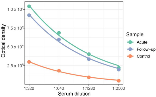 ELISA dilution series specific for Mundri virus anti-nucleocapsid IgG antibodies of index case acute, index case 12-month follow-up, and Dutch control sample.