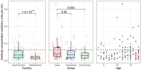 Age was not significantly associated with antibody concentration (p = 0.13, linear regression, Figure 5, right panel) nor with seropositivity (p = 0.33, logistic regression) amongst the South Sudanese children. There was no clustering of seropositive samples amongst children living in the same household (cases and household controls, Supplementary Table S1, p = 1, Fisher’s exact test). Lastly, there was no association between M. perstans microscopical positivity and MUNV seropositivity (Supplementary Table S2, p = 0.12, Fisher’s exact test).