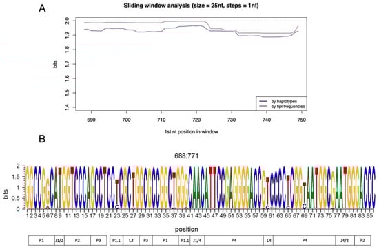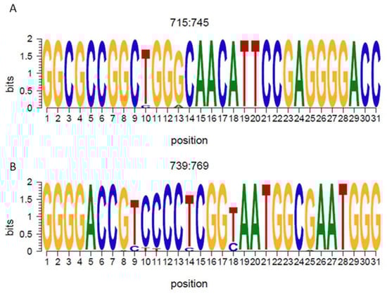 The most conserved region was between nt 715–745 (Figure 2A), where 100% of the nucleotide presented a conservation of more than 1.5 bits. The most variable region encompassed positions 739 and 769, as described previously [41]. In this region, 3 nt positions presented a conservation of less than 1.5 bits (3/31 nts), although 80% (25/31) of the nts showed a high level of conservation (Figure 2B).