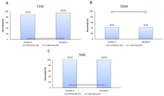 Although the relative frequency of mutations is generally maintained, in some patients some mutations were positively or negatively selected, such as the T23C mutation in patient 2 (from 5.29% to 17.07%), and in patient 12 (from 9.52% to 36.97) (Figure S2A) and the T69C mutation in patients 2 (from 43.88% to 71.85%) and patient 12 (from 2.79% to 24.11%) retracted in patient 13 (from 91.15% to 39.09%) (Figure S2C).