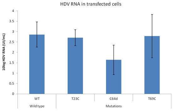 Considering the high degree of ribozyme conservation, the observed mutations may potentially affect HDV fitness, thus promoting or inhibiting viral expression. To test the effect of the three detected principal mutations (T23C, C64d, T69C) of HDV expression, the plasmids carrying the desired mutations will be transfected in the presence of HBV and the HDV RNA titer was quantified in transfected cell supernatants 72 h after transfection. We efficiently expressed HDV in vitro, obtaining a mean ± SD titer of 2.86 ± 0.61 IU/mL 72h after transfection. The T69C mutant showed a similar replication rate than wt (2.78 ± 1.04 UI/mL, p = 0.662). Of note, in the presence of the mutation T23C (2.7 ± 0.38 IU/mL, p = 1), the HDV titer was reduced around 1.05-fold. The interference with viral expression was even more strong in presence of the deletion in position 64 (C64d) that caused a reduction in viral expression of around 1.22log (HDV RNA = 1.63 ± 0.71 UI/mL, p = 0.08) (Figure 5).