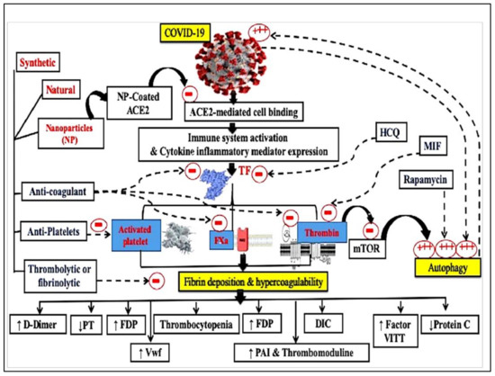 Schematic diagram representing the different coagulation system mechanisms and possible types of coating nanoparticles for targeting ang I and II receptors. DIC, disseminated intravascular co-agulation; Fxa, activated factor x; PT, prothrombin time; TF, tissue factor; Hydroxychloroquine—HCQ; Macrophage migration inhibitory factor—MIF; Fibrin degradation products—FDP; Von Willebrand factor—Vwf; Mammalian target of rapamycin—mTOR; plasminogen activator inhibitor—PAI.