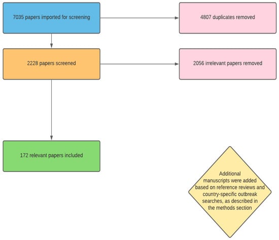 | Ivory Coast (Côte d’Ivoire) | 2017, 2019 [58,67] | Sporadic/Uncertain | |