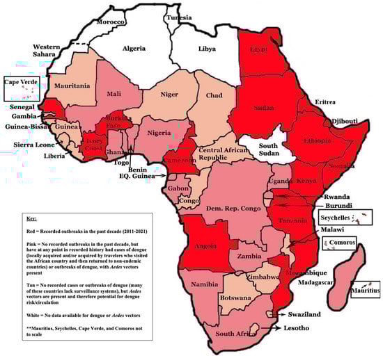 Gainor, E.M.; Harris, E.; LaBeaud, A.D. Uncovering the Burden of Dengue in Africa: Considerations on Magnitude, Misdiagnosis, and Ancestry. Viruses 2022, 14, 233. https://doi.org/10.3390/v14020233