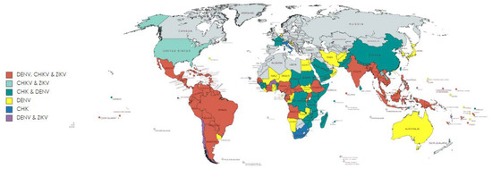 Global distribution of CHIKV, DENV and ZIKV infections. This map shows the global transmission of CHIKV, DENV and ZIKV. The map was created using the free online tool (https://mapchart.net/detworld.html; accessed on 17 December 2021) and inspired by [2]. The figure was created based on the data provide be following websites (accessed on 17 December 2021): https://www.cdc.gov/dengue/areaswithrisk/around-the-world.html; https://www.gov.uk/guidance/zika-virus-country-specific-risk#atoz; https://www.cdc.gov/chikungunya/geo/index.html.
