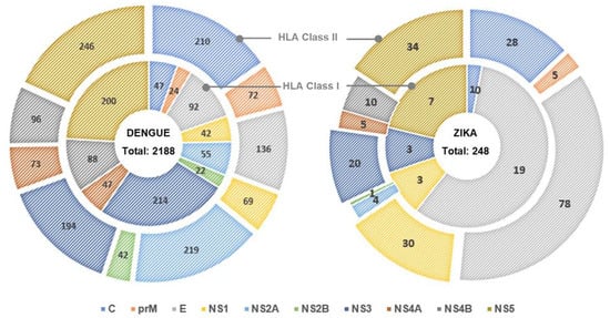 Number of immunodominant T cell epitopes against dengue (DENV) and Zika viruses (ZIKV). Data were retrieved from the IEDB (on 30 November 2021) corresponding to the HLA restriction (HLA class I: inner circle, HLA II: outer circle) and protein region.