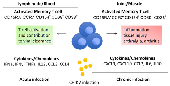 Unlike other alphaviruses, CHIKV infection has higher clinical presentation, where 50–97% of infected patients can develop clinical symptoms. CHIKV infection is also associated with higher disease morbidity than mortality [5,29]. In addition, CHIKV has detrimental effects on tissues, partly mediated by an over-activated host immune system, with a robust immune response associated with type-I interferon (IFN) pathways. In the majority of patients, CHIKV replicates at very high levels in the blood (up to 1010 viruses/mL of blood) during the acute symptomatic phase. However, CHIKV replicates without any clinically apparent sequalae [30]. This is the acute recovery/resolving phase where the immune system plays an important role in viral clearance and T cells contribute to limit the spread of virus. In elderly patients where viremia is high and long-lasting, a chronic phase that can last from months to years is usually associated with marked inflammatory reaction, recurring arthralgia and arthritis [31]. Figure 3 represents how T cells respond during acute and chronic infection of CHIKV, releasing specific cytokines and chemokines into lymph nodes and tissues, respectively [5].
