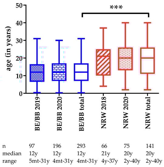 Box plots (median and range) showing the age distribution in the sampled horses from the regions Berlin/Brandenburg (BE/BB) and North Rhine–Westphalia (NRW) (n total = 434, n in NRW 2018 = 66, n in NRW 2020 = 75, n in BE/BB in 2019 = 97, n in BE/BB in 2020 = 196, for 3 horses the age had not been reported). ***, p ≤ 0.0001; Berlin/Brandenburg (BE/BB) and North Rhine–Westphalia (NRW), mt, months, y, years.