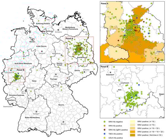 In detail for panel B (NRW): In 2018, the two positive ELISA samples could be confirmed as TBEV-specific antibodies. In 2020, out of three positive and one doubtful ELISA samples, we detected two with WNV-specific antibodies and two with TBEV-specific antibodies.