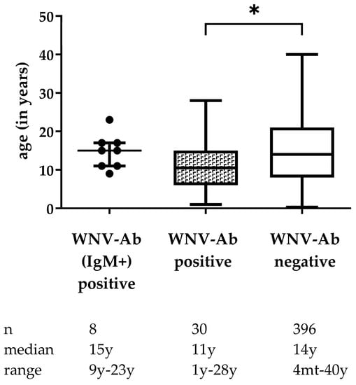 Fisher’s exact test showed that the distribution of breed or sex did not differ significantly between the seropositive horses compared to the seronegative horses (p = 0.35 and p = 0.58). Seropositive horses showed a lower median age than the seronegative horses. (Figure 3, p = 0.04).