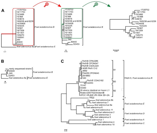 The analysis of all FAdV-B strains (Figure 2C) indicated, again, the questionable typing result of strain TR22. This strain was isolated in Japan in the 1960s and was serotyped as FAdV-5 [48]. However, our findings confirmed previous results [49], as the strain was not monophyletic with other FAdV-B strains. The serological typing results of this strain remain questionable, and a repeated cross-neutralization assay would be supported.