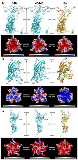 In spite of a notable genetic distance, in other words, a relatively low sequence identity, the divergent FAdV-B strains did not represent a novel serotype. Therefore, to determine the structural background of this, the three-dimensional protein models of the serodeterminant major capsid proteins were generated for the reference (340) and the divergent FAdV-5 strain (40440), as well as an FAdV-8a strain (TR59), based on the following aa sequences: AGL34683, QCC26485 and ANJ02525 (penton base); AGL34687, QCC26479 and ANJ02529 (hexon); and finally AGL34695, QCC26484 and ANJ02537 (fiber). FAdV-8a served as a positive control, as it represented a clearly distinct serotype compared to any FAdV-5 strain. All models were generated using the Robetta structure prediction server [24]. Not only did this application generate the monomer models, but it also created the appropriate biological assemblies: pentamer from penton base, and trimers from hexon and fiber subunits. The output protein model structures were refined with the MacroModel energy minimization module of the Schrödinger Suite [25] to eliminate steric conflicts between the side-chain atoms. The models were visualized in VMD version 1.9.3 [26]. Electrostatic potential maps were calculated with Adaptive Poisson–Boltzmann Solver (APBS) version 1.3 using the linearized Poisson–Boltzmann method [27] with a dielectric constant of 78.0 and 2 for the water solvent and the protein core, respectively. The partial charges in the electrostatic potential were calculated with PDB2PQR [27].