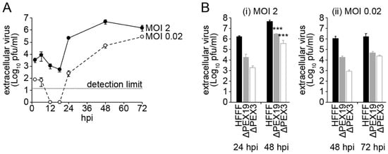 Since the influence of peroxisomes on DENV replication has only been tested using transient siRNA-mediated silencing of PEX19 [], we set out to measure the impact of complete peroxisomal loss on DENV replication using an established patient-derived fibroblast model. First, we assessed the replication kinetics of DENV-2 in primary human foetal foreskin fibroblasts (HFFF) by performing single-step and multi-step growth curves in HFFF cells (Figure 1A). At a high multiplicity of infection (MOI 2), DENV-2 replication peaked 48 h post-infection (hpi). Meanwhile, DENV-2 replication had not yet plateaued 72 hpi in a multi-step growth curve (MOI 0.02). We next infected HFFF cells (serving as our ‘wild-type’ control) and established PEX19-deficient [] and PEX3-deficient [] patient-derived human fibroblasts at MOI 2 and 0.02 and analysed viral titres at three different time-points. Both cell lines completely lack peroxisomes due to mutations in proteins that are crucial in PMP import machinery. PEX19-deficient cells lack a functional PEX19 chaperone, which precludes the transport of PMPs, including PEX3, to peroxisomes while PEX3-deficient cells lack PEX3, precluding PMP import into peroxisomal membranes, but have a functional PEX19 [,]. We observed a 1–3 log reduction in DENV-2 replication at all time points tested during both high and low MOI infection in both peroxisome-deficient cell lines (Figure 1B). The differences between the PEX19- and PEX3-deficient cell lines are not statistically significant (two-way ANOVA; Tukey correction for multiple comparisons). These results suggest that peroxisomes are required for optimal DENV replication and reinforce earlier reports of an important role of peroxisomes in the life cycle of flaviviruses.