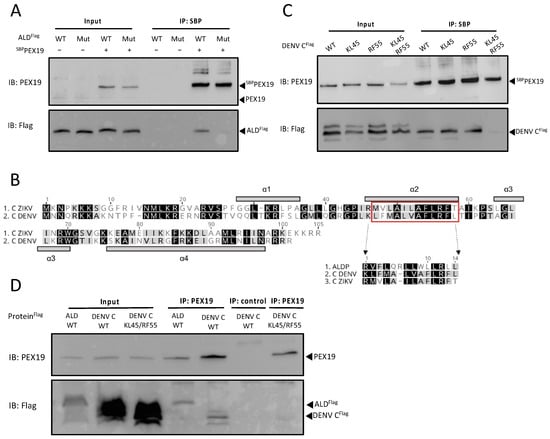 Next, we performed site-directed mutagenesis of conserved residues within the predicted PEX19-binding motifs to assess their functional importance for PEX19 binding, a strategy that has been successfully applied to inhibit the PEX19-cargo interaction of several physiological PMP substrates of PEX19 [,,]. We first used the streptavidin pull-down assay to assess whether such mutations would interfere with the interaction between ALD and PEX19. By replacing four of the conserved residues (either basic or hydrophobic amino acids) within the PEX19-binding motif of ALD by alanine or glycine (ALDflag Mut.: R69A, V70G, R80A, L81G), a mutated variant with a disturbed PEX19-binding motif was generated. Pull-down experiments revealed that only ALDflag WT, but not the mutated variant (ALDflag Mut), which lacks key conserved residues, was able to form complexes with PEX19 (Figure 2A). An identical approach was applied to DENV C, to assess whether the corresponding alterations within the putative PEX19-binding motifs of DENV C would negatively affect their binding to PEX19 (Figure 2C). Replacing either the consecutive residues lysine-leucine at positions 45 and 46 (K45A and L46G, referred to as KL45) or arginine-phenylalanine at positions 55 and 56 (R55A and F56G, referred to as RF55) did not affect the interaction between DENV C and PEX19, but a combination of these mutations (K45A, L46G, R55A and F56G, referred to as KL45/RF55) resulted in the loss of the ability of DENV C to bind PEX19.