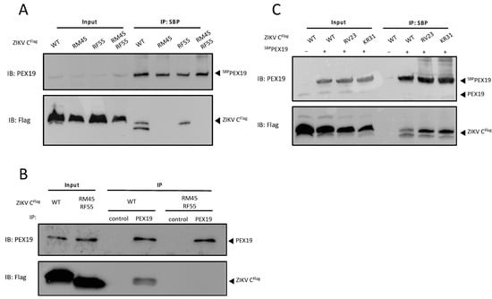 Finally, in addition to the overexpression experiments using SBPPEX19, we examined whether the identified PEX19-binding motif of DENV C is also necessary for binding to endogenous PEX19. As shown by coimmunoprecipitation using anti-PEX19 antibodies, only the WT DENV C was able to interact with PEX19 (Figure 2D).