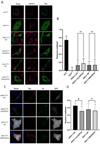 Recently, PEX19 was found to not only be responsible for the transportation of integral PMPs to peroxisomes, but also for being a key element in targeting of proteins to lipid droplets (LDs) []. LDs are endoplasmic reticulum (ER)-derived organelles that store energy as triglycerides, which are surrounded by a phospholipid monolayer. LD membrane proteins are embedded into this monolayer in a monotopic hairpin topology []. Similar to mature flaviviral C proteins, they do not contain a bilayer-spanning transmembrane segment, and therefore are unusual PEX19 substrates. Interestingly, recent evidence suggests that the mature C proteins of ZIKV and DENV accumulate on the surface of LDs [,,], hence it is tempting to speculate that interaction of the C proteins with PEX19 might be important for facilitating their sorting to these ER-derived organelles. This hypothesis is supported by the fact that amino acids L50 and L54 of the DENV C protein, which are both localized within the identified PEX19-binding motif (Figure 2B), are specifically necessary for correct targeting of the C protein to LDs []. Therefore, we assessed whether other C protein variants that lost their ability to interact with PEX19 (ZIKV C RM45/RF55 and DENV C KL45/RF55) likewise fail to be sorted to LDs. As expected, WT version of both DENV and ZIKV C localized to lipid droplets (Figure 4C). No changes to this lipid droplet localization were observed when comparing ZIKV C RM45/RF55 with the WT (Figure 4C,D). However, there was a small but significant decrease in LD localization of DENV C KL45/RF55 (Figure 4C,D). Nevertheless, the DENV C protein still retained most of its ability to localize at the LD membrane, which would not be expected to occur if PEX19 was solely responsible for its transportation to these organelles. Therefore, these results suggest that binding to PEX19 is not an essential prerequisite for the proper targeting of ZIKV and DENV C to LDs or peroxisomes.
