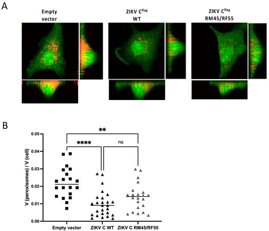 Expression of ZIKV capsid proteins causes loss of peroxisomes. (A) A549 cells were transfected with pIRES2-EGFP-derived plasmids encoding the ZIKV C WT or mutated variant (ZIKV C RM45/RF55) of the ZIKV C protein, or the empty vector as negative control. At 72 h post transfection, cells were processed for indirect immunofluorescence using mouse anti-PMP70 antibodies for the detection of peroxisomes (in red). Images show the top and side view Z stack reconstruction of a single cell. (B) Z-stack images of GFP-positive cells were acquired in 0.2 μm intervals, and peroxisome abundance analysis was performed using the total volume of peroxisomes:total volume of the cell ratio. Statistical analysis was carried out using an ordinary one-way ANOVA with Tukey’s multiple comparisons test (n > 20; ns = non-significant, ** = p < 0.01, **** = p < 0.0001).