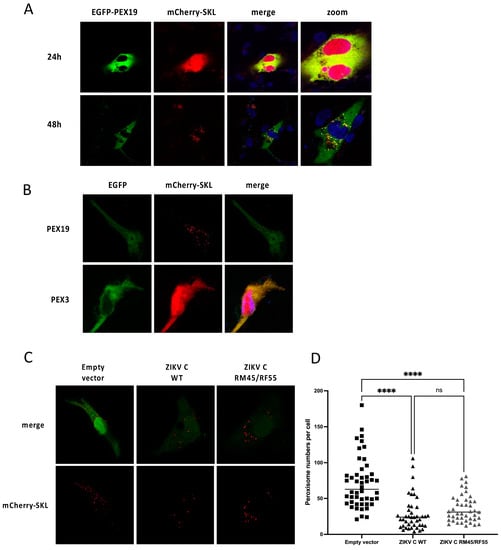 Then, to assess the reoccurrence of functional peroxisomes in PEX19-deficient fibroblasts in the presence of ZIKV C, cells were transfected with a plasmid to co-express PEX19 and mCherry-SKL, and another to express either ZIKV C WT or ZIKV C RM45/RF55. Notably, de novo peroxisome biogenesis was significantly delayed at 48 h post-transfection in the presence of ZIKV C WT, suggesting that the reduction of peroxisome abundance by ZIKV C is, at least in part, due to impairment of de novo peroxisome biogenesis. Interestingly, a similar delay in peroxisome reconstitution was observed in cells expressing the mutated variant ZIKV C RM45/RF55 (Figure 6C,D), which does not bind PEX19, suggesting that the impairment in peroxisome biogenesis is not mediated by the interaction between PEX19 and ZIKV C. Thus, ZIKV C may interfere with peroxisomal abundance and biogenesis by a yet unknown, PEX19-independent mechanism.